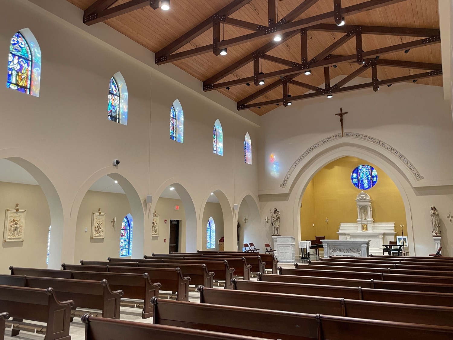 The Catholic Cemetaries of Long Island commissioned Lawrence Hoy Studios to design the interior and construct the liturgical furnishings and artwork for its new Queen of Peace Chapel. One of our hallmarks, whenever possible, is to repurpose beautiful artwork, stained-glass or marble from other churches to add timeless beauty and character to a new church.  At Queen of Peace Chapel (now in progress) we repurposed, restored and installed exquisite stained-glass windows of the “Life of Mary”, as well as a pair of majestic wrought iron front entrance doors. We also restored and installed an incredible 100-year-old carved marble reredos as the backdrop for a new carved Carrara marble altar and ambo, which we designed and fabricated. A beautifully carved mahogany narthex screen will finish off this remarkable showcase of stunning liturgical design.